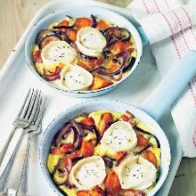 | Goat's log and sweet potato frittata with crispy pancetta recipe | delicious. magazine butter, red onion, pancetta, goat's cheese, olive oil, sweet potato, eggs, bacon Put the sweet potato and a pinch of salt into a pan of water and bring to the boil. Simmer for 10-15 minutes, until just tender. Drain and set aside. Meanwhile, heat half the oil and the butter in a ...