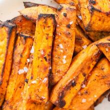 | Crispy Sweet Potato Fries Recipe - Food.com egg whites, butter flavored spray, sweet potato, salt, taco seasoning, flour Mixed different recipes and tips and came up with this. Serving Size: 1 (132) g Servings Per Recipe: 4 AMT. PER SERVING % DAILY VALUE Calories: 113.9 Calories from Fat 1 g 1 % Total Fat 0.1 g 0 %...