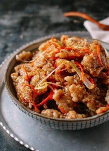 | Dongbei Guo Bao Rou (Crispy Sweet & Sour Pork) - The Woks of Life pork loin, potato starch flour, light soy sauce, shaoxing wine, sesame seed oil, oil, ginger root, coriander, carrot, spring onion, garlic, salt, rice vinegar, sugar, water This Dongbei Guo Bao Rou recipe (东北鍋包肉) looks and sounds distant to many. Basically, it is a more delicate version of Sweet and Sour Pork. It has humble origins in H...