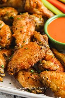 | Baked Buffalo Wings {Extra Crispy} - Spend With Pennies buffalo, chicken wing, pepper, salt, baking powder, flour These baked buffalo wings are the ultimate game day feast. Crispy chicken wings are baked in the oven then tossed in a spicy buffalo sauce. Preheat oven to 425 F. Pat wings dry with a paper towel. To...