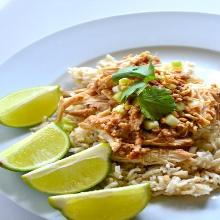 | Skinny Crock Pot Thai Peanut Chicken chicken breast, red pepper, brown rice, vegetable stock, peanut, coriander, cumin, lime, spring onion, onion, peanut butter, soy sauce 1. Place chicken in the base of crock pot. Top with red pepper and onion. 2. In a bowl, mix together peanut butter, lime juice, vegetable broth, soy sauce, and cumin. Pour sauce over chicken. 3. Cook ...