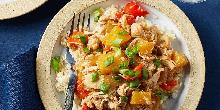 | Crock-Pot Pineapple Chicken Recipe | EatingWell chicken thigh, red bell pepper, red pepper, chicken stock, cornstarch, sesame seed oil, ginger root, pineapple, spring onion, onion, garlic, soy sauce This slow-cooker chicken with pineapple has a hint of ginger and sesame and is made with simple ingredients you may already have in your pantry! Look for fresh pineapple that's been peeled and cor...