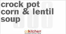 | Crock Pot Corn & Lentil Soup Recipe | CDKitchen.com chicken thigh, tomato paste, chicken stock, turmeric, pepper, cinnamon, lentil, onion, celery, sweetcorn, salt, lemon juice A recipe for Corn & Lentil Soup made in the crock pot made with chicken thighs, lentils, onion, celery, tomato paste, turmeric, cinnamon, chicken broth Place chicken thighs in a crock pot with len...