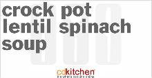 | Crock Pot Lentil Spinach Soup Recipe | CDKitchen.com chicken, tomato sauce, thyme, white peppercorn, parsley, marjoram, cayenne pepper, cumin, bay leaf, basil, lentil, potato, carrot, onion, garlic, celery, swiss chard, spinach, salt, stock or broth A recipe for Lentil Spinach Soup made in the crock pot made with dried lentils, frozen chopped spinach, Swiss chard, tomato sauce, potatoes, onions Put all ingredients into a 5 qt. crock pot. Add wate...