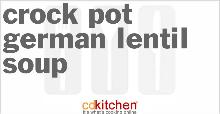 | Crock Pot German Lentil Soup Recipe | CDKitchen.com hot sauce, chicken stock, pepper, parsley, nutmeg, celery salt, caraway, dried garlic, bay leaf, lentil, carrot, onion, celery, ham, worcestershire sauce A recipe for German Lentil Soup made in the crock pot made with dried brown lentils, chicken stock, bay leaf, carrots, celery, onion, ham, Worcestershire Place lentils in a 5 to 6 quart slow cooker. A...