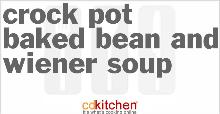 | Crock Pot Baked Bean And Wiener Soup Recipe | CDKitchen.com butter, baked beans, frankfurter, mustard powder, onion, garlic, worcestershire sauce, cheddar cheese, vegetable fat spread, tomato juice, water, flour A recipe for Baked Bean And Wiener Soup made with onion, frankfurters, garlic, butter or margarine, all-purpose flour, dry mustard, tomato In large pan, saute onion, wieners and garlic in margarine un...