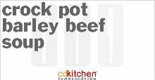 | Crock Pot Barley Beef Soup Recipe | CDKitchen.com beef stewing meat, beef stock, barley, pepper, bay leaf, carrot, onion, celery, salt A 5-star recipe for Barley Beef Soup made in the crock pot made with stew beef, onion, celery, carrots, barley, bay leaf, salt and pepper, beef Combine all the ingredients in the crock pot and stir we...