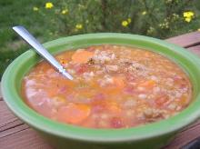| Vegetable-Beef Barley Soup (Crock Pot) Recipe - Food.com beef stewing meat, tomato sauce, bell pepper, beef stock, vegetables, barley, thyme, pepper, dried garlic, onion, tomato, salt, water This has been a favorite in our home for many years. Great on those cold winter days. Serve with fresh homemade rolls for a complete meal. Serving Size: 1 (315) g Servings Per Recipe: 10 AMT. PER SE...