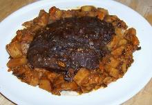 | Brisket of Beef in Tomato Onion Gravy (Crock Pot) Recipe - Food.com beef brisket, beef stock, tomato soup, onion soup mix, pepper, balsamic vinegar, red wine vinegar, brown sugar, water, flour From Delicious and Dependable Slow Cooker Recipes by Judith Finlayson. *You can make this overnight and once cooked, you can refrigerate it. When meat is cooled, slice thinly. Place in a Dutch oven, c...