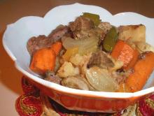 | Spiced Beef Stew In A Crock Pot Recipe beef stewing meat, red potato, chili dried/powder, beef stock, white peppercorn, celery seed, cinnamon, cumin, bay leaf, allspice, button mushroom/champignon, carrot, spring onion, garlic, tomato, sweetcorn, salt, brown sugar, red wine, water, flour Serve this hearty dish with crusty bread. Combine all ingredients in crock pot. Cook on low for 8-10 hours or high for 6 hours. If thickening is needed, add water & flour and cook on high for 15-3...