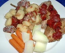 | Creamy Chicken or Pork Cacciatore in Crock Pot Recipe - Food.com chicken, mashed potato, tomato paste, green pepper, gravy, chicken stock, pepper, oregano, basil, olive, mushrooms, carrot, onion, garlic, celery, tomato, salt, old bay seasoning, pasta So easy, so good and the aroma will excite Serving Size: 1 (347) g Servings Per Recipe: 6 AMT. PER SERVING % DAILY VALUE Calories: 203.6 Calories from Fat 53 g 26 % Total Fat 6 g 9 % Saturated F...