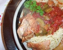 | Crock Pot Chicken Cacciatore Recipe | SparkRecipes chicken breast, tomato sauce, tomato paste, green bell pepper, chili dried/powder, olive oil, oregano, basil, onion, garlic, salt, white wine Great over pasta or rice! 1. Place onions in bottom of crock pot. 2. Add chicken pieces. 3. Stir all the other ingredients together. 4. Pour over chicken. 5. Cook on low heat 7 to 9 hours of high for ...