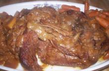 | Crock Pot Caramelized-Onion Pot Roast Recipe - Food.com beef chuck steak, beef stock, olive oil, oil, pepper, onion, mustard, apple cider vinegar, salt, brown sugar, beer/lager Another crock pot winner! The onions become meltingly tender. Make sure to serve with crusty bread to dip into the juices! Serving Size: 1 (261) g Servings Per Recipe: 12 AMT. PER SERVING % DAILY VA...