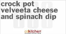 | Crock Pot Velveeta Cheese And Spinach Dip Recipe | CDKitchen.com hot sauce, velveeta cheese, pepper, onion, spinach, cheddar cheese, cream cheese, half and half A recipe for Velveeta Cheese And Spinach Dip made in the crock pot made with Velveeta cheese, cheddar cheese, cream cheese, half and half, chopped frozen spinach Grease a 3-quart crock pot. Combine th...