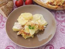 | Ham and Swiss Cheese Potatoes (Crock Pot) Recipe - Food.com swiss cheese, potato chip, potato soup, ricotta cheese, pepper, marjoram, peas, onion, garlic, ham, parmesan cheese I found this in a book that I must return to the library so am posting for future reference. This comes from The $7 a Meal Slow Cooker Cookbook. Kids especially will love this recipe. It's hot, cr...