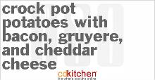 | Crock Pot Potatoes With Bacon, Gruyere, And Cheddar Cheese Recipe | CDKitchen.com pepper, potato, onion, bacon, salt, cheddar cheese, cheese A recipe for Potatoes With Bacon, Gruyere, And Cheddar Cheese made in the crock pot made with bacon, onions, potatoes, Gruyere cheese, Cheddar cheese, salt and Fry diced bacon until starting to crisp....