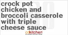 | Crock Pot Chicken And Broccoli Casserole With Triple Cheese Sauce Recipe | CDKitchen.com chicken, broccoli, parmesan cheese, cheddar cheese, cream cheese, sour cream, milk A recipe for Chicken And Broccoli Casserole With Triple Cheese Sauce made in the crock pot made with milk, cream cheese, Cheddar cheese, Parmesan cheese, sour cream, broccoli, cooked Heat a saucepan o...