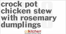 | Crock Pot Chicken Stew With Rosemary Dumplings Recipe | CDKitchen.com chicken stock, oil, rosemary, pepper, peas, carrot, onion, celery, whole chicken, eggs, salt, baking powder, milk, flour A recipe for Chicken Stew With Rosemary Dumplings made in the crock pot made with all purpose flour, salt, pepper, whole chicken, vegetable oil, carrots, celery, onion In a bowl or plastic bag, combin...