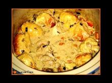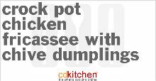| Crock Pot Chicken Fricassee With Chive Dumplings Recipe | CDKitchen.com chicken breast, chicken soup, cooking spray, thyme, rosemary, pepper, paprika, chives, onion, salt, baking powder, fat, lemon juice, milk, water, flour A recipe for Chicken Fricassee With Chive Dumplings made in the crock pot made with cream of chicken soup, water, onions, paprika, lemon juice, rosemary, thyme, salt Spray crock pot with non-stick coo...