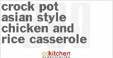 | Crock Pot Asian-Style Chicken And Rice Casserole Recipe | CDKitchen.com butter, chicken, chicken stock, almond, mushrooms, spring onion, soy sauce, rice, vegetable fat spread A 5-star recipe for Asian-Style Chicken And Rice Casserole made in the crock pot made with rice, butter or margarine, chicken broth, cut-up cooked chicken, mushrooms, soy sauce Mix rice with melted bu...