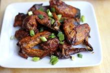 | Crock Pot Asian Spiced Chicken Wings Recipe | CDKitchen.com chicken wing, hoisin sauce, dry sherry, sesame seed, ginger root, spring onion, garlic, soy sauce, tomato ketchup/catsup, brown sugar, lime juice Wings are broiled first to crisp up the skin, then are slow cooked in a soy sauce mixture until done. To finish, they are drizzled with hoisin sauce and sprinkled with sesame seeds and green onions Br...