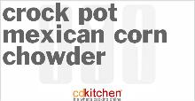 | Crock Pot Mexican Corn Chowder Recipe | CDKitchen.com green bell pepper, creamed corn, chicken stock, green chili, dried garlic, potato, onion, sweetcorn, worcestershire sauce, salt, monterey jack cheese, cheddar cheese, vegetable fat spread A recipe for Mexican Corn Chowder made in the crock pot made with potatoes, cream style corn, whole kernel corn, chicken bouillon granules, diced green Cover potatoes with water and boil gently, uncov...