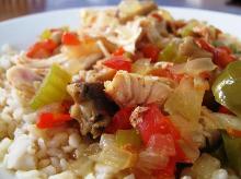| Crock Pot Louisiana-Style Chicken Creole Recipe | CDKitchen.com chicken thigh, red bell pepper, green bell pepper, hot sauce, pepper, paprika, dried garlic, mushrooms, onion, celery, tomato, salt, cajun seasoning, rice, sugar Low-country style chicken creole with the convenience of a slow cooker. Chicken thighs with classic Cajun veggies, hot sauce, and tomatoes all served over rice. Place the chicken pieces in the bottom ...