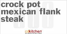 Crock Pot Mexican Flank Steak Recipe | CDKitchen.com beef flank steak, red onion, pepper, oregano, coriander leaf, garlic, tomatillo, tomato, sweetcorn, salt A recipe for Mexican Flank Steak made in the crock pot made with flank steak, tomatillos, baby corn, red onion, garlic, salt, black pepper, dried oregano Trim flank steak to remove any visible fat. Re...