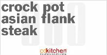 | Crock Pot Asian Flank Steak Recipe | CDKitchen.com beef flank steak, oil, pepper, ginger root, pineapple, worcestershire sauce, soy sauce, salt, brown sugar, sherry, pineapple juice A 5-star recipe for Asian Flank Steak made in the crock pot made with flank steak, oil, pineapple rings, pineapple juice, soy sauce, ginger, sherry, brown Roll and tie flank steak, tie and cut into si...
