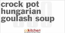 | Crock Pot Hungarian Goulash Soup Recipe | CDKitchen.com beef stewing meat, green bell pepper, beef stock, pepper, paprika, potato, onion, garlic, tomato, bacon, salt, sugar, sour cream A recipe for Hungarian Goulash Soup made in the crock pot made with bacon, onion, green bell pepper, garlic, beef stew meat, paprika, salt, black pepper In a large kettle, cook bacon until almost cris...