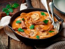 | Crock Pot Beef And Mushroom Goulash Recipe | CDKitchen.com beef stewing meat, tomato soup, oil, pepper, paprika, bay leaf, mushrooms, onion, salt, sour cream, water A 5-star recipe for Beef And Mushroom Goulash made in the crock pot made with oil, beef, fresh mushrooms, onion, tomato soup, water, bay leaf, salt, black pepper Heat the oil in a skillet over medium-...