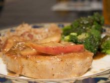 | Juicy Crock Pot Apple Pork Chops Recipe | CDKitchen.com pork chop, mushroom soup, nutmeg, cinnamon, apple, onion, apple juice, water Let's make the pledge together: no more tough, dried out pork chops. Cooking these chops in the crockpot keeps them plenty juicy, with a killer sweet and savory flavor profile. Place the apples an...