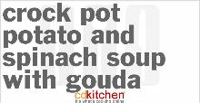 | Crock Pot Potato And Spinach Soup With Gouda Recipe | CDKitchen.com evaporated milk, gouda cheese, red onion, chicken stock, olive oil, pepper, parsley, cayenne pepper, potato, garlic, spinach, salt, water A 5-star recipe for Potato And Spinach Soup With Gouda made in the crock pot made with Yukon Gold potatoes, chicken broth, water, red onion, baby spinach, cayenne pepper In a 4-quart slow cooker, comb...