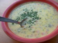 | Crock-Pot Potato-Cheese Soup Recipe | SparkRecipes chicken stock, cornstarch, parsley, paprika, potato, carrot, onion, celery, bacon, cheddar cheese, milk, water This is a delicious, lower-fat version of a family favorite. Place all ingredients except milk, cornstarch, and cheeses in crockpot, set on low, to cook all day. 10 minutes before serving, add cheeses...