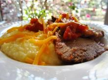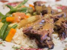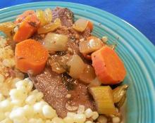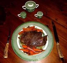 | Balsamic Pot Roast (Crock Pot) Recipe - Food.com beef steak, beef stock, cornstarch, olive oil, rosemary, carrot, onion, garlic, tomato, beef, balsamic vinegar, fat, water Balsamic vinegar and rosemary give this pot roast a great flavor. Serve with cooked egg noodles or mashed potatoes. Serving Size: 1 (124) g Servings Per Recipe: 8 AMT. PER SERVING % DAILY VALUE Cal...