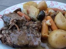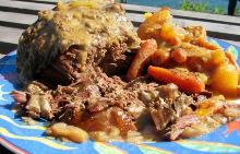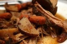 | Crock Pot California Pot Roast Recipe | CDKitchen.com butter, beef stock, canola oil, pepper, dried ginger, olive, prune, mushrooms, onion, garlic, zucchini/courgette, salt, red wine, water A recipe for California Pot Roast made in the crock pot made with pot roast, salt, ground ginger, black pepper, butter, canola oil, garlic, onions, dry red Rub the roast with salt, pepper and ginger a...