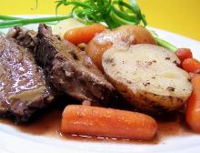 | Crock Pot Beef Roast Recipe - Food.com beef chuck steak, beef stock, mushroom soup, olive oil, pepper, mushrooms, potato, carrot, onion, celery, salt, beer/lager, ale I wanted a pot roast and stew like vegetables all in one, so came up with this. Serving Size: 1 (567) g Servings Per Recipe: 4 AMT. PER SERVING % DAILY VALUE Calories: 1110.2 Calories from Fat 632...