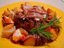 | Crock Pot Pot Roast Recipe - Food.com beef rump roast, thyme, rosemary, pepper, onion, garlic, salt, red wine, water, flour Perfect served with a salad, baked potatoes, and a green vegetable. Very tender meat. Serving Size: 1 (220) g Servings Per Recipe: 8 AMT. PER SERVING % DAILY VALUE Calories: 485.7 Calories from Fa...