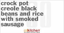 | Crock Pot Creole Black Beans and Rice With Smoked Sausage Recipe | CDKitchen.com tomato sauce, green bell pepper, black beans, chicken stock, thyme, white peppercorn, pepper, oregano, cayenne pepper, bay leaf, onion, garlic, celery, sausage, rice, water A 5-star recipe for Creole Black Beans and Rice With Smoked Sausage made in the crock pot made with smoked sausage, black beans, onions, green bell pepper, celery, garlic, dried thyme Brown sausage in...