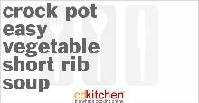 | Crock Pot Easy Vegetable Short Rib Soup Recipe | CDKitchen.com ribs, beef stock, peppercorn, potato, carrot, onion, celery, tomato, salt A recipe for Easy Vegetable Short Rib Soup made in the crock pot made with short ribs or oxtails, diced tomatoes, carrots, celery, onions, potatoes, beef broth Combine the ribs and remaining ingredien...