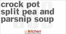 | Crock Pot Split Pea And Parsnip Soup Recipe | CDKitchen.com split peas, vegetable stock, olive oil, thyme, pepper, nutmeg, cinnamon, parsnip, onion, celery, tomato, ham, salt A recipe for Split Pea And Parsnip Soup made in the crock pot made with onion, celery, olive oil, black pepper, yellow split peas, parsnips, tomatoes, vegetable Saute the onion in olive oil, season wi...