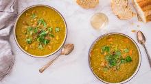 | Vegan Split Pea Soup (crock pot/ slow cooker) Recipe | SparkRecipes split peas, liquid smoke, hot sauce, pepper, marjoram, cayenne pepper, cumin, carrot, onion, garlic, celery, salt, water This was adapted from another split pea soup without proper calorie count. This makes 4 big servings (enough for a meal with a slice of toast or some croutons on top or a 1/2 cup of fruit) Rinse and p...