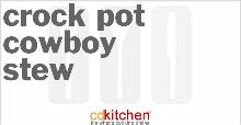 | Crock Pot Cowboy Stew Recipe | CDKitchen.com beef steak, chili pepper, kidney bean, potato, carrot, onion, celery, tomato, sweetcorn A recipe for Cowboy Stew made in the crock pot made with tomatoes, chili seasoning, frozen whole-kernel corn, potatoes, red kidney beans, onion Spray a slow cooker container with butter-flavored cooki...