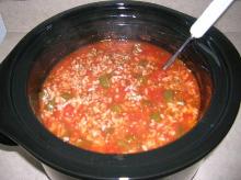 | Crock Pot Stuffed Pepper Soup Recipe | CDKitchen.com tomato sauce, green bell pepper, ground beef, tomato, seasoning, rice, brown sugar All your favorite ingredients from traditional stuffed bell peppers are mixed into one easy and delicious slow cooked soup. Mix all ingredients except cooked rice in crockpot. Cover and cook on low fo...