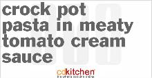 | Crock Pot Pasta In Meaty Tomato Cream Sauce Recipe | CDKitchen.com heavy cream, ground beef, basil, onion, garlic, tomato, sausage, pasta A 5-star recipe for Pasta In Meaty Tomato Cream Sauce made in the crock pot made with ground beef, Italian sausage, onion, garlic, tomato and basil pasta sauce, diced peeled Brown meat and onions in a...