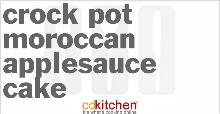 Moroccan Applesauce Cake Crockpot Recipe | CDKitchen.com butter, apple sauce, bicarbonate of soda, walnut, vanilla, cinnamon, date, raisin, eggs, salt, sugar, chocolate, flour A recipe for Moroccan Applesauce Cake made in the crock pot made with butter, sugar, eggs, vanilla, applesauce, baking soda, flour, cinnamon, salt, chocolate Cream butter and sugar. Add eggs one at a ...
