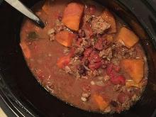 | Crockpot Sweet Potato Turkey Chili Recipe | SparkRecipes tomato sauce, chili dried/powder, ground turkey, oregano, green chili, cumin, sweet potato, onion, tomato warm comforting stew with a myriad of possibilities for variation once everything is chopped you just add it all to the slow cooker on low for 8-10 hours (however long it takes the sweet potatoes be t...