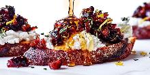 | Grilled goats' cheese crostini with honey and thyme served on a herb salad recipe - BBC Food goat's cheese, olive oil, thyme, mint, chervil, basil, balsamic vinegar, bread, honey Cut out two 5cm/2in circles of bread using a pastry cutter. Drizzle each with a little olive oil. Heat a griddle pan and griddle for two minutes on each side, or until golden. Preheat the grill to me...