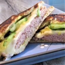 | Open-Faced Cuban Sandwich dill pickle, swiss cheese, ham, beef, mustard, bread Crunch from the toasted bread, gooey from the cheese, and tangy from the mustard and pickles, it's all the classic Cuban sandwich flavors you love. On each of four slices toasted country bread spr...
