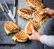 | Grilled Cuban Sandwich Culinary Cafe sandwich, pork loin, dill pickle, swiss cheese, ham, mustard Prepare a wood or charcoal fire and allow it to burn to embers. Layer each sandwich with the cheese, ham, pork and pickles. Grill the sandwich, top side down for 1 minute, turn over and place a saute ...